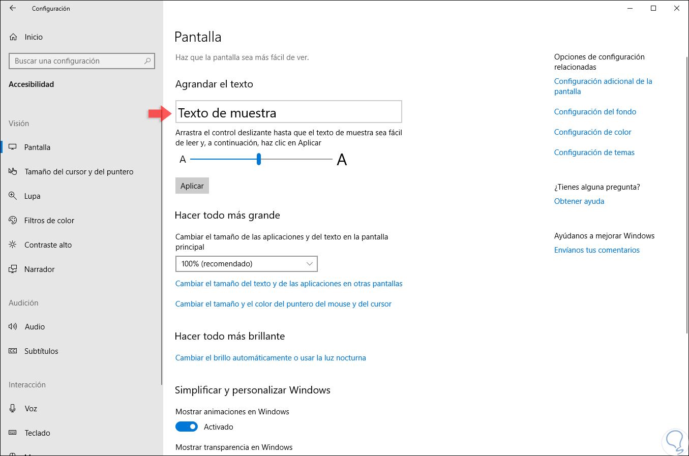 Allí, en la sección “Agrandar el texto”, moveremos el control deslizante hacia el lado derecho del borde de la pantalla para aumentar el tamaño del texto según consideremos necesario. Pulsamos en Aplicar para guardar los cambios.