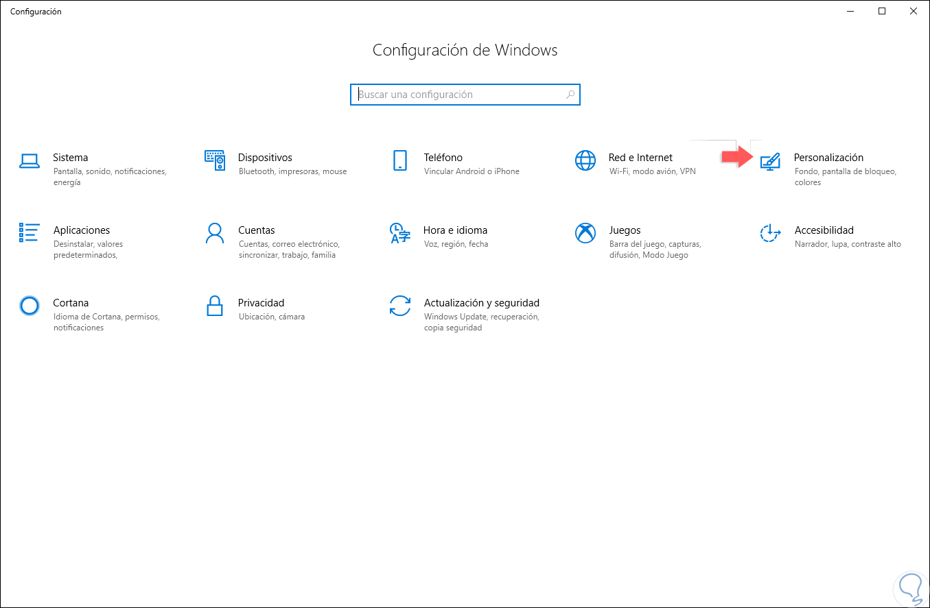 Para establecer este protector de pantalla en Windows 10, iremos al menú Inicio y allí seleccionamos la utilidad “Configuración” donde veremos lo siguiente: