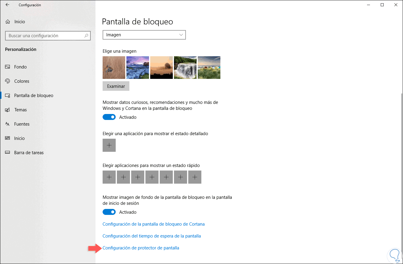 Allí vamos a la categoría “Personalización” y en la nueva ventana iremos a la sección “Pantalla de bloqueo” y en la parte inferior veremos la línea “Configuración de protector de pantalla”: