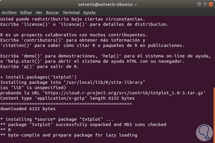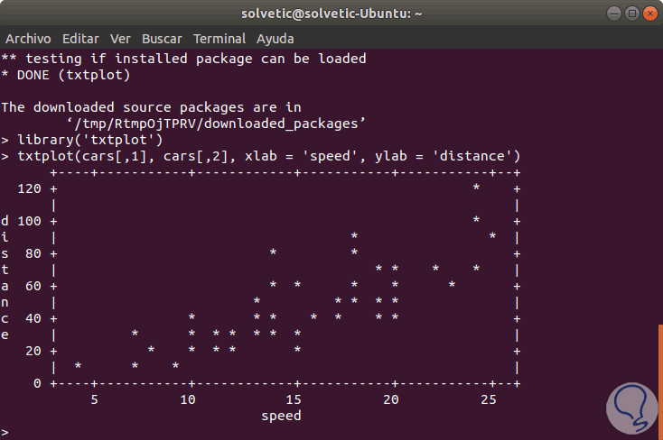 R es una aplicación que posee un gran número de paquetes complementarios disponibles, para este caso vamos a instalar txtplot, el cual es una biblioteca que genera gráficos ASCII donde se incluyen diagramas de dispersión, diagramas de líneas, diagramas de densidad, acf y gráficos de barras.