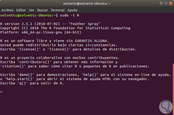 Una vez instalado R en Ubuntu 18, vamos a comprobar su uso ejecutando una sesión interactiva como usuarios root con el siguiente comando: