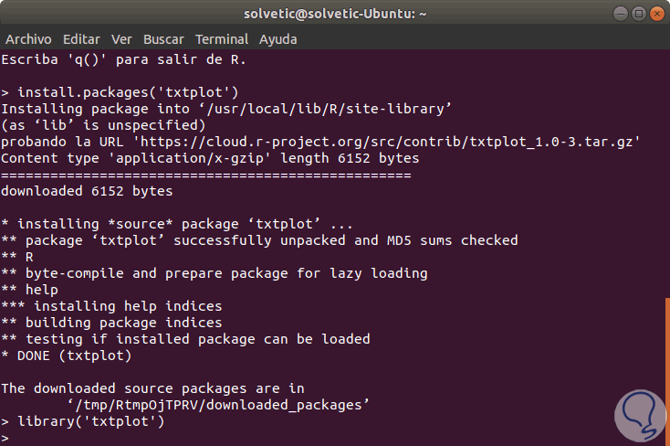 Una vez instalado vamos a cargar el paquete instalado. Si no hay mensajes de error, significa que la biblioteca se cargó correctamente.
