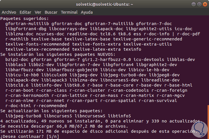 Ingresamos la letra S para confirmar la descarga e instalación de R en Ubuntu 18.