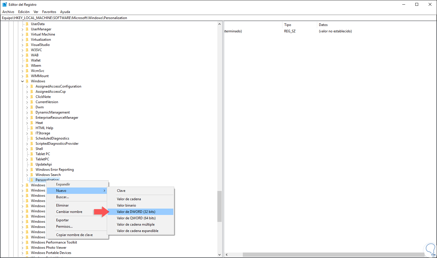 Esta nueva clave será llamada “Personalization” y ahora daremos clic derecho sobre ella y seleccionamos la opción “Nuevo / Valor de DWORD (32 bits)”:
