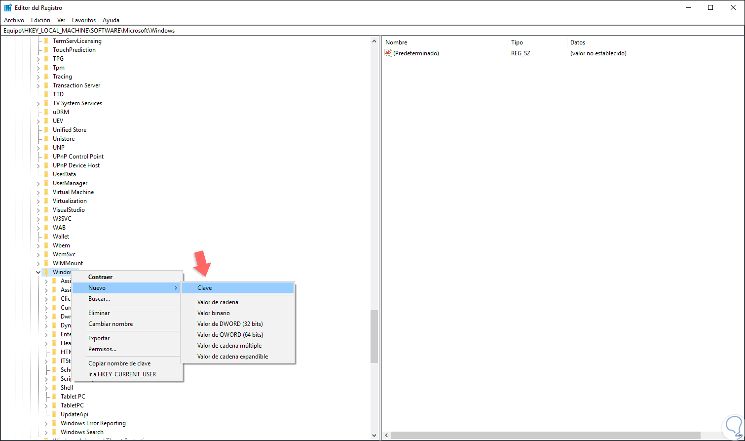Allí daremos clic derecho sobre la clave Windows y seleccionamos la opción “Nuevo / Clave”: