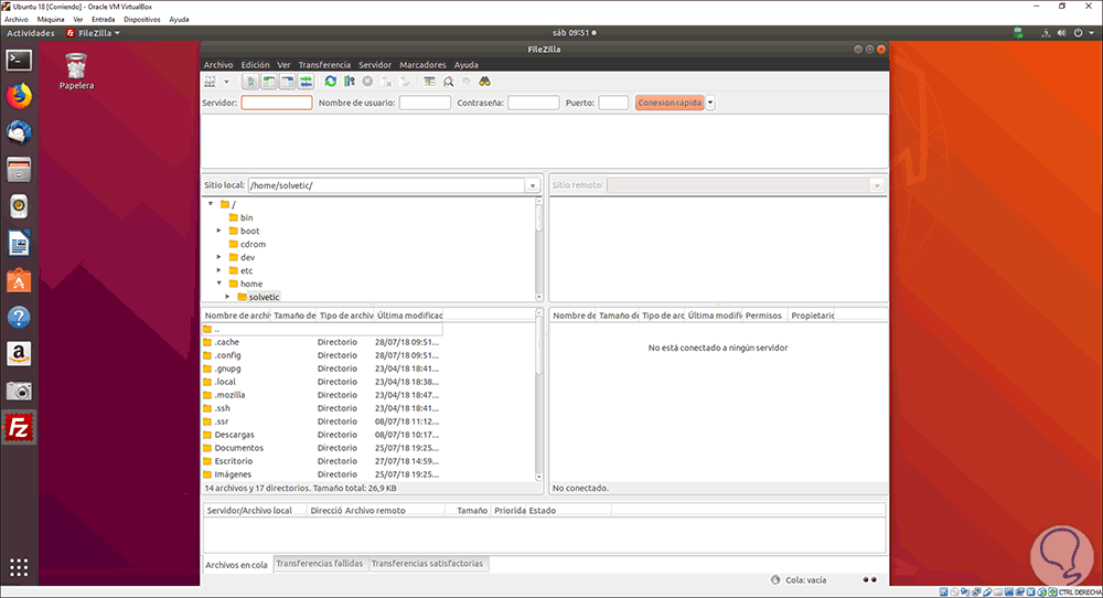 sudo apt-get install filezilla -yUna vez instalado, en este caso vamos a acceder desde Ubuntu 18.04 Desktop, accedemos a la aplicación donde veremos lo siguiente: