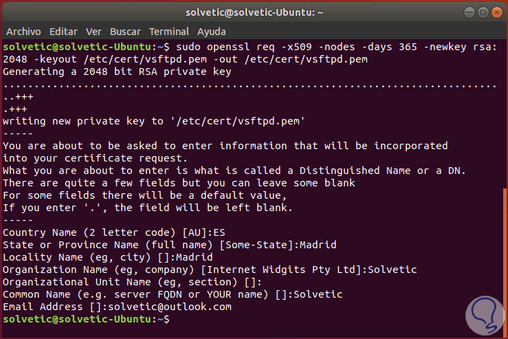 En este caso, cuando se crea el certificado se solicitan detalles como: