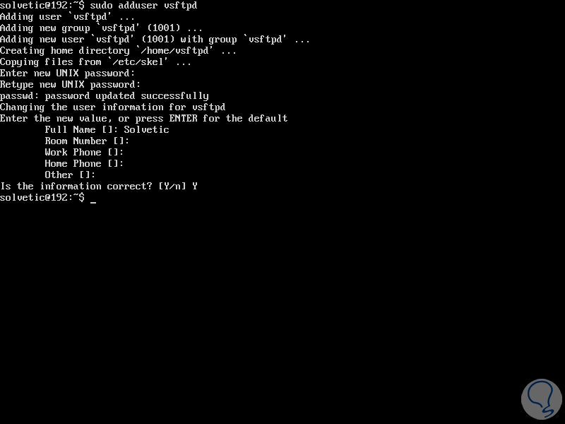 sudo adduser vsftpdSerá necesario completar la información, si aplica, desplegada: