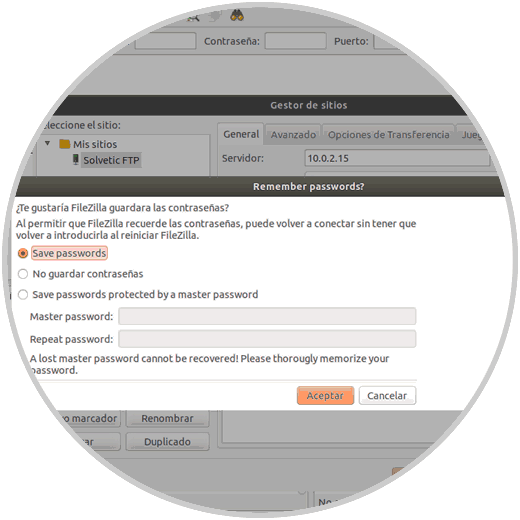 Pulsamos en el botón Conectar y se desplegará el siguiente mensaje. Allí definimos si deseamos guardar o no las contraseñas.