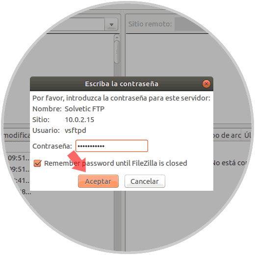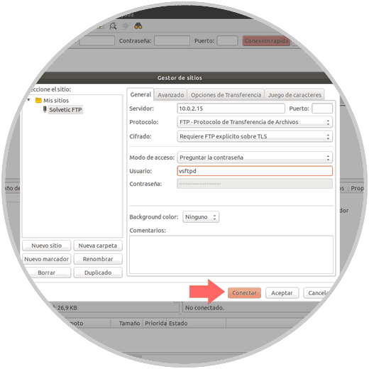 - En el campo Modo de acceso establecemos Preguntar la contraseña e ingresamos el nombre del usuario creado en VSFTPD