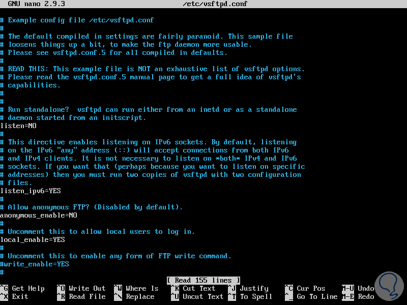 sudo nano /etc/vsftpd.confEste será el archivo de configuración: