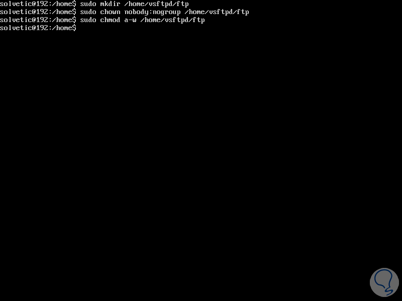 sudo mkdir /home/vsftpd/ftp sudo chown nobody:nogroup /home/vsftpd/ftp sudo chmod a-w /home/vsftpd/ftp