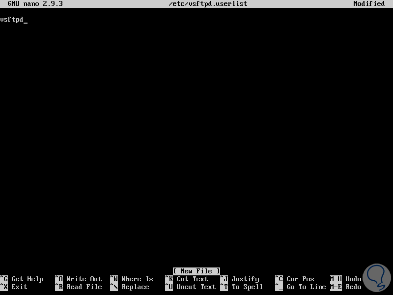 Guardamos los cambios usando la combinación de teclas Ctrl + O y salimos del editor usando Ctrl + X. Ahora, vamos a agregar el usuario de vsftp al archivo /etc/vsftpd.userlist para permitir el acceso FTP: