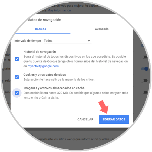 Damos clic sobre ella y en la ventana abierta seleccionamos la opción Todos en el campo Intervalo de tiempo y activamos todas las casillas disponibles. Pulsamos en el botón Borrar datos para confirmar la acción.