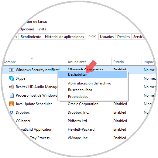 Damos clic en la línea Abrir el Administrador de tareas y en la sección desplegada daremos clic derecho sobre cada elemento y elegimos la opción Deshabilitar: