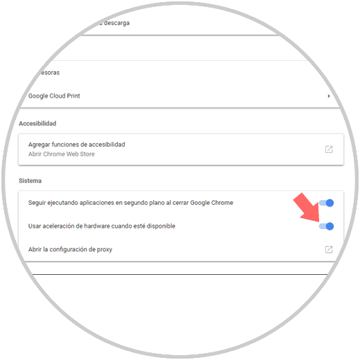 En la ventana desplegada iremos a la sección Sistema y allí ubicamos la línea llamada Usar aceleración de hardware cuando esté disponible y veremos que por defecto está habilitada: