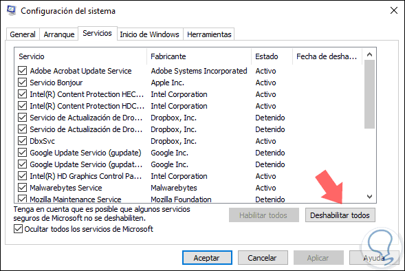 - Activamos la casilla Ocultar todos los servicios de Microsoft