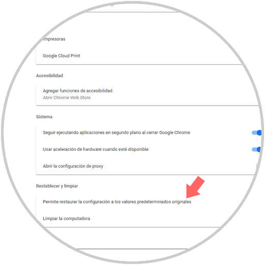 Para restablecer Google Chrome vamos a la configuración avanzada del sistema y allí nos desplazamos a la sección Restablecer y limpiar y damos clic en la opción Permite restaurar la configuración a los valores predeterminados originales: