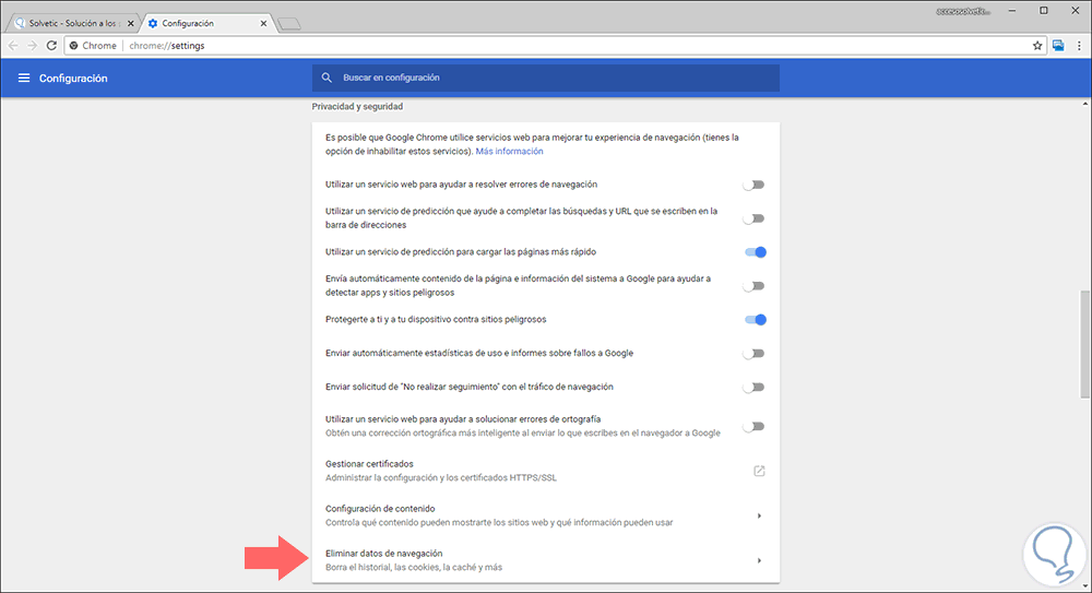 Para borrar esta caché, iremos de nuevo a la configuración avanzada de Google Chrome y en la sección Privacidad y seguridad ubicamos la opción Eliminar datos de navegación:
