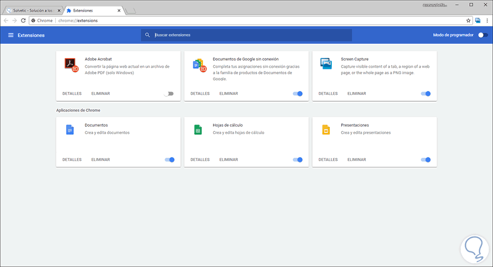 En la ventana desplegada desactivamos las extensiones pulsando sobre el interruptor de cada una de ellas: