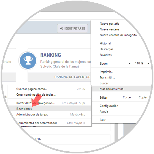 En caso de persistir el error, otra de las opciones es deshabilitar las extensiones o complementos del navegador, para ello iremos al menú Personaliza y controla Google Chrome y allí vamos a la ruta Mas herramientas / Extensiones: