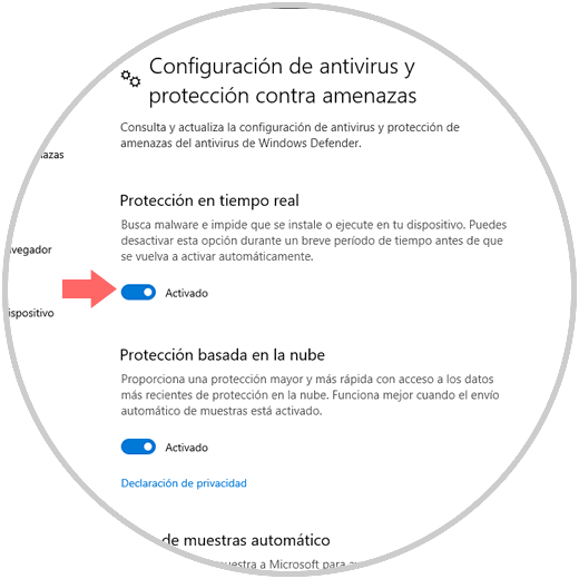 Aunque es una posibilidad extraña, podemos proceder a deshabilitar el software antivirus para validar si esta es la causa del problema y en caso de ser así tomar las medidas de soporte necesarias. En caso de contar con el software antivirus integrado de Windows 10, debemos ir a la sección Protección antivirus y contra amenazas y allí pulsar en el interruptor Protección en tiempo real para proceder con la deshabilitacion temporal del antivirus: