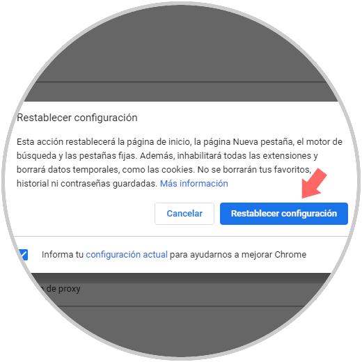 Se desplegará el siguiente mensaje. Pulsamos en el botón Restablecer configuración para proceder con la acción.