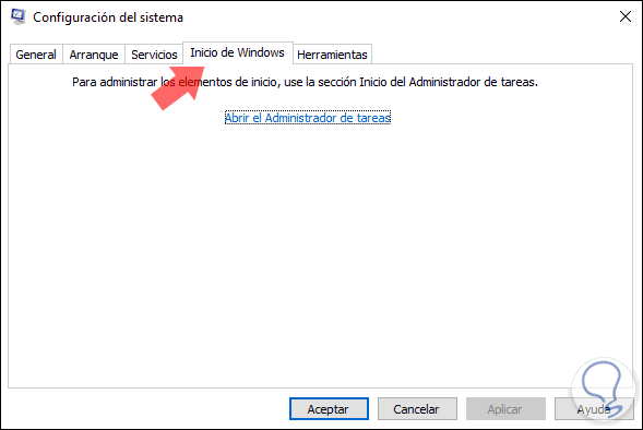 Pulsamos en el botón Aceptar o damos Enter y en la ventana desplegada vamos a la pestaña Servicios y allí realizamos lo siguiente: