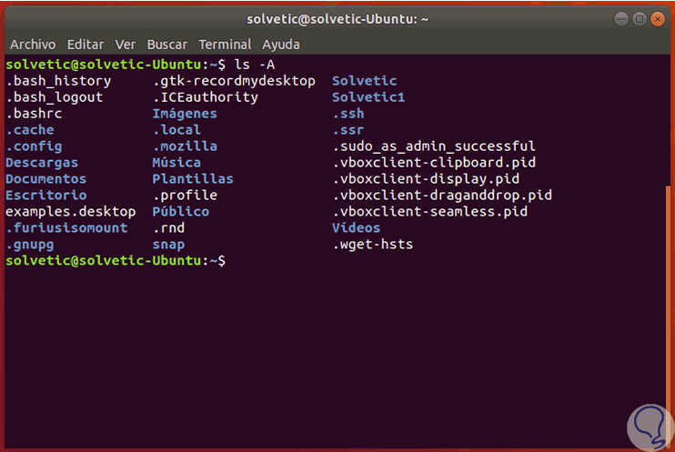 Para mostrar todos los archivos, las carpetas incluidas y las carpetas ocultas, pero excluyendo el directorio actual y la carpeta principal representadas por “.” y “..”, se ejecutará: