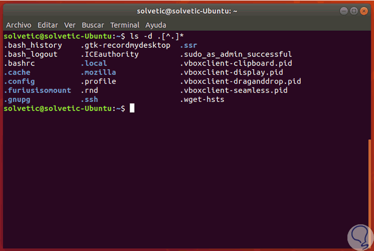 Para mostrar solo los archivos ocultos, será necesario especificar una expresión regular con el comando ls, de esta forma se mostrará solo el archivo y las carpetas ocultos: