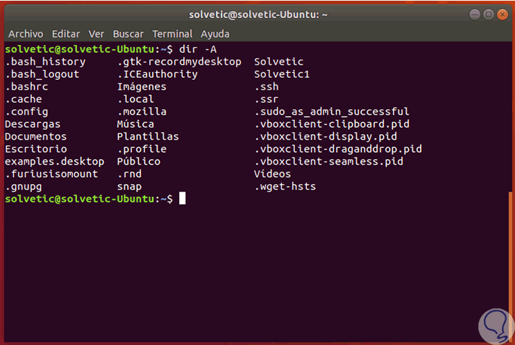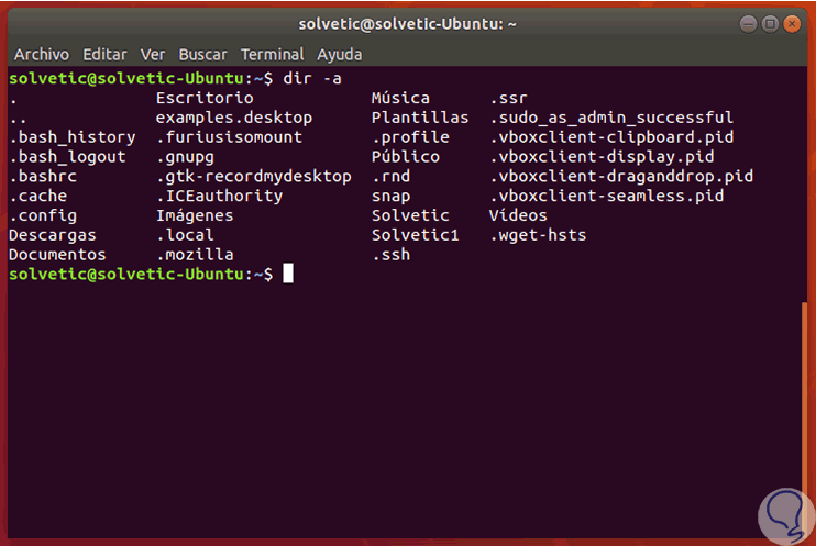 2. Ver archivos y subcarpetas ocultos en una carpeta usando el comando dir en Linux