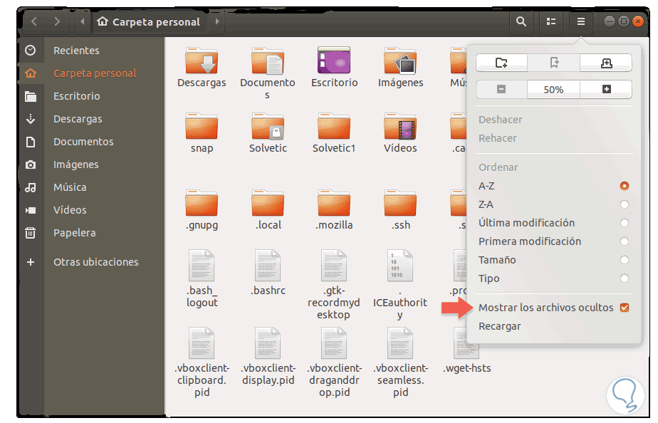 Además, si usamos el entorno Gnome, podemos acceder al editor de archivos usando las teclas siguientes o pulsando en el icono de configuración y allí seleccionar la casilla “Mostrar los archivos ocultos”: