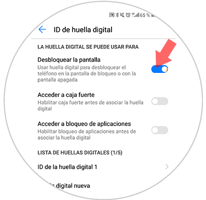 En esta nueva pantalla vamos a encontrar las diferentes gestiones a las que podremos acceder a través del uso de nuestra huella dactilar. Veremos que en primer lugar está "Desbloquear" la pantalla. Para que que no se pueda desbloquear el teléfono con la huella debemos desplazar la pestaña azul hacia la izquierda ya que si se encuentra deslizada hacia la derecha el teléfono nos pedirá la huella para poder desbloquearlo.