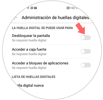 Así entrarás en la pantalla de “Administración de huellas dactilares”. Aquí desactiva la pestaña “La huella digital se puede usar para desbloquear la pantalla” y habrás terminado.
