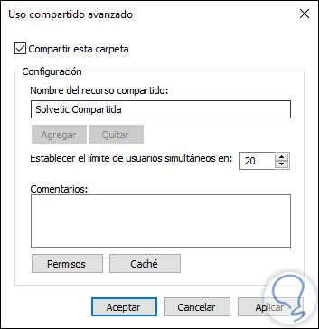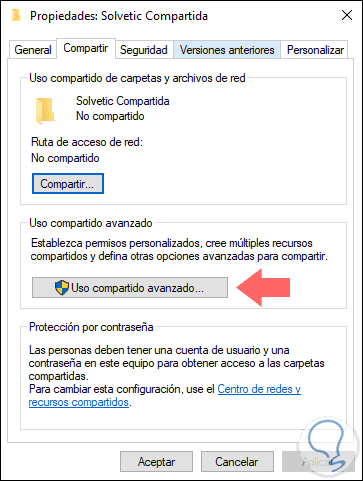 Allí damos clic en el botón Uso compartido avanzado y en la ventana desplegada realizamos lo siguiente: