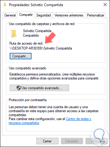 Se desplegará la siguiente ventana y allí nos dirigimos a la pestaña Compartir donde veremos lo siguiente: