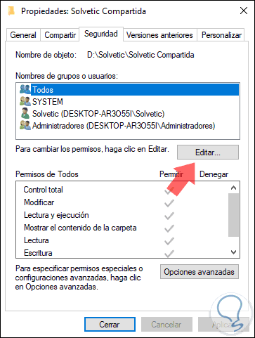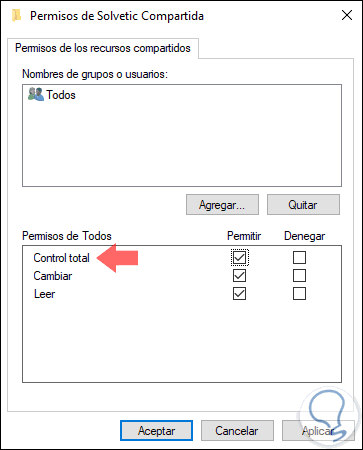 Ahora, pulsamos en el botón Permisos y allí seleccionamos Todos y activamos la casilla Control total. Pulsamos en el botón Aplicar y Aceptar para guardar los cambios.