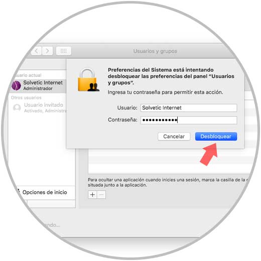 Allí seleccionamos la categoría Usuarios y grupos y luego debemos pulsar en el icono de candado en la parte inferior para habilitar los cambios e ingresaremos nuestra contraseña: