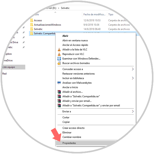 El primer paso a dar consiste en compartir la carpeta en Windows 10, para ello creamos una nueva carpeta y daremos clic derecho para seleccionar la opción Propiedades: