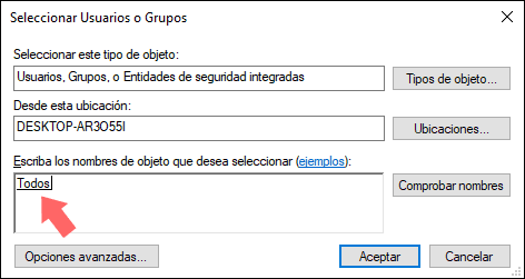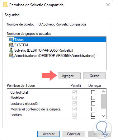 Debemos validar que se encuentre el usuario Todos y que tenga los permisos de Control total, en caso de no ser así, pulsamos en el botón Agregar y en el cuadro emergente ingresamos Todos. Pulsamos en Aceptar y asignamos el permiso respectivo.