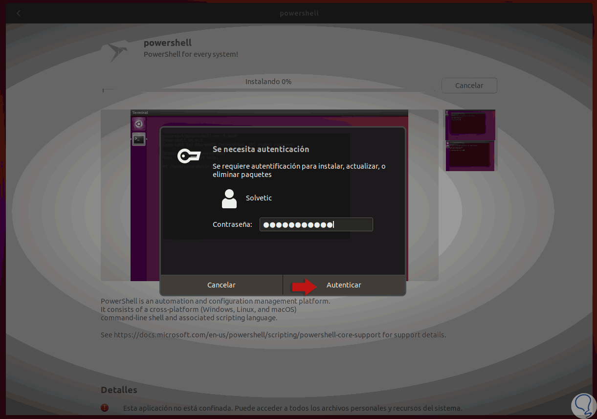 Pulsamos en “Autenticar” e iniciará el proceso de instalación de PowerShell: