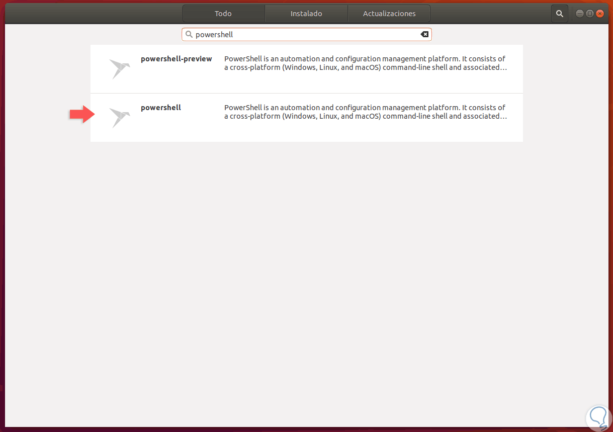 Una vez instalado Snap, podemos ir al centro de Software de Ubuntu y desde allí buscar PowerShell, obtendremos los siguientes resultados: