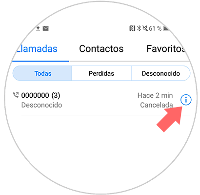 Ahora vamos a ver el listado de las llamadas que hemos realizado y recibido en nuestro Huawei P20 Pro dentro de la sección de "llamadas" - "todas". Debemos seleccionar en este caso el icono de "información" situado en la parte derecha del número.