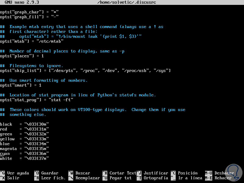 sudo cp /etc/discusrc ~/.discusrcLuego abrimos este archivo usando algún editor según sea requerido: