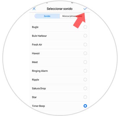 Si prefieres que suene una canción o audio que tengas descargada en el teléfono, desliza la barra superior de la pantalla a la opción “Música” y aquí aparecerán audios y canciones que tengas guardado en la memoria de tu Huawei. Para confirmar esta acción debes seleccionar aquella que te interesa y hacer clic sobre el tick azul situado en la esquina superior derecha.