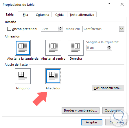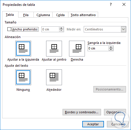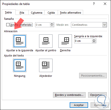 En la ventana desplegada debemos ir a la pestaña Tabla y en la sección Alineación, será posible será posible definir el nivel de ajuste deseado de la tabla yanto a la izquierda, derecha o centro: