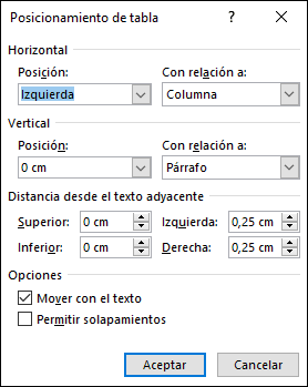 En caso de alinear la tabla hacia el lado izquierdo de la página, también será posible ajustar el espacio de la sangría desde el margen izquierdo haciendo uso del cuadro Sangría a la izquierda: