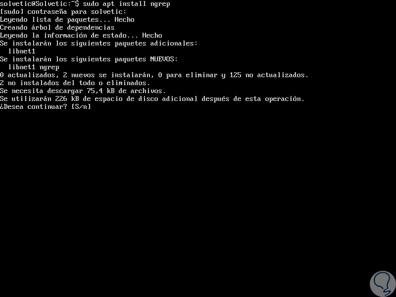 Ingresamos la letra S para confirmar la descarga e instalación del paquete ngrep. Después de que se complete la instalación de ngrep, será posible comenzar a analizar el tráfico de red en Linux y así acceder a información vital de este segmento.