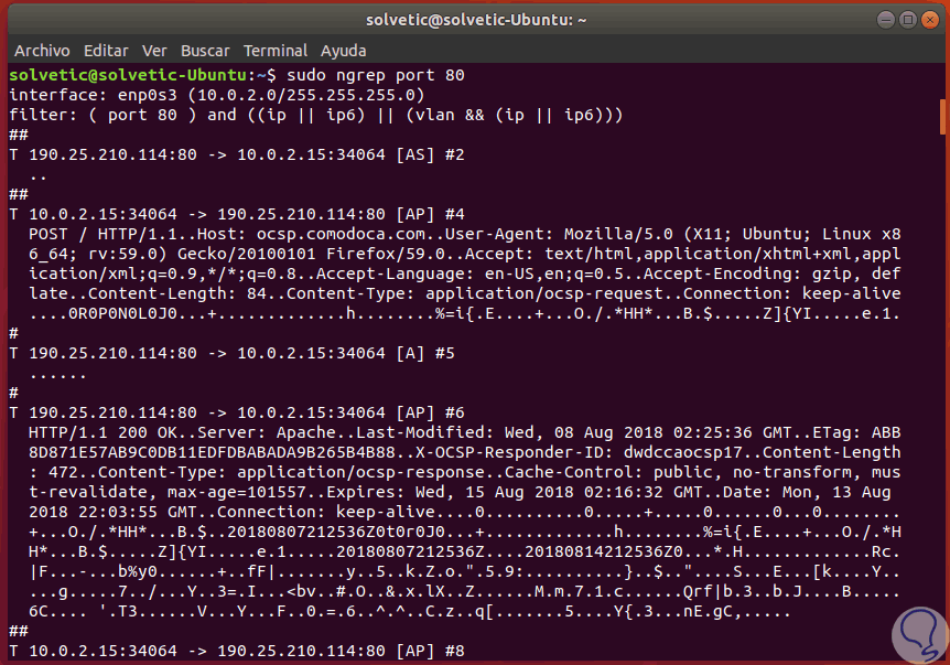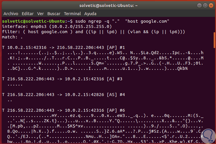 Al usar ngrep será posible especificar una expresión regular o hexadecimal extendida para que esta coincidia con las cargas útiles de datos del sistema.