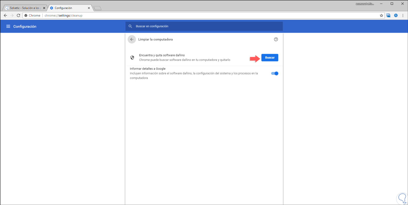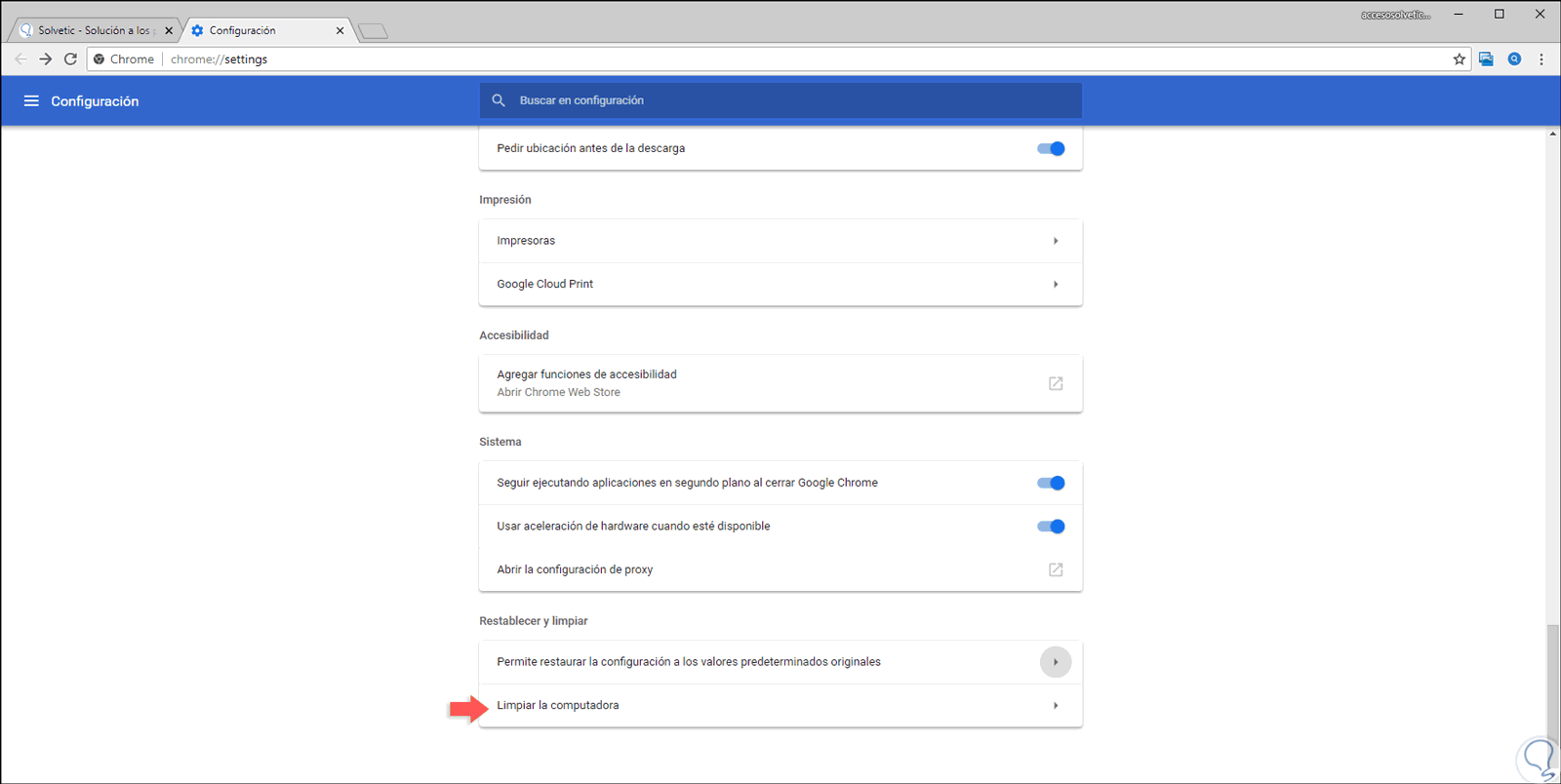 Para ejecutar esta utilidad, vamos de nuevo a la sección “Avanzada” en la configuración de Google Chrome y en la sección “Restablecer y limpiar” pulsamos en el botón “Limpiar la computadora”: